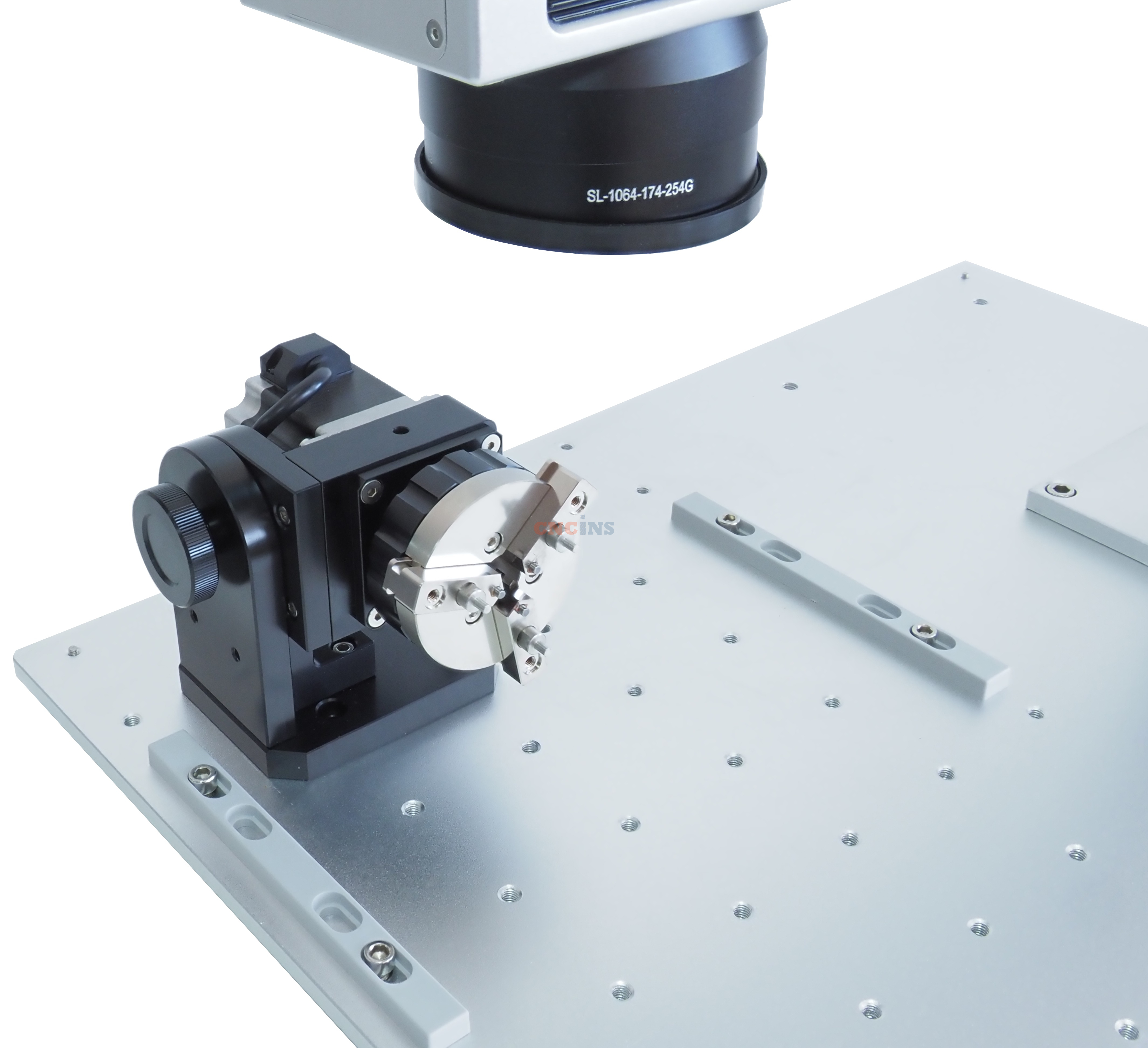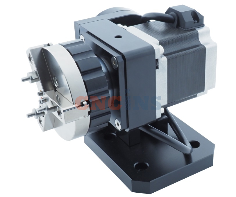 Поворотное устройство D65 используется для фиксации и вращения детали цилиндрической формы с последующим нанесением маркировки или гравировки. Конструктивно устройство представляет собой блок с тремя зажимными кулачками, обеспечивающими надежную фиксацию изделия диаметром от 1 до 65 мм. Управление вращением осуществляется через специальный контроллер модели DM542. В основании вращателя расположены 4 отверстия для его фиксации на рабочем столе маркировщика.