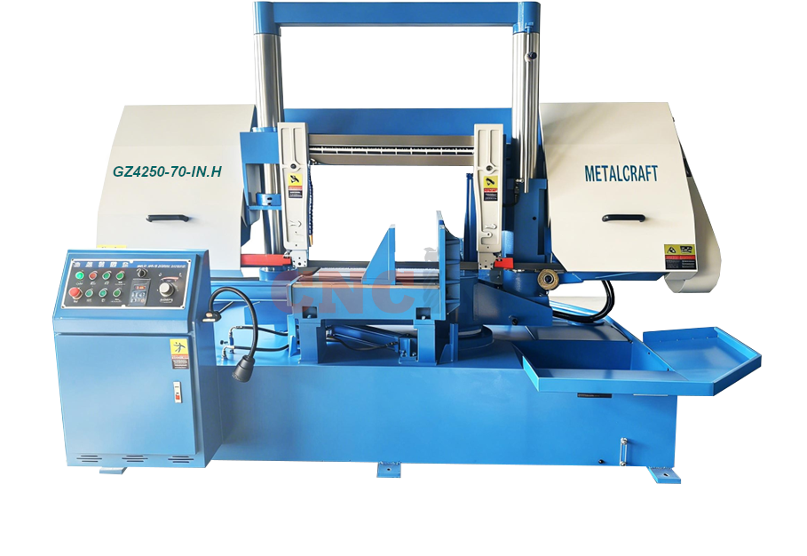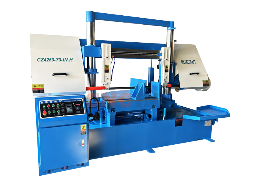 Станок GZ4250-70-IN.H используется для распила профилей, сплошных заготовок из инструментальных, нержавеющих сталей, чугуна, цветных металлов и других материалов. Область применения: средне- и крупносерийное производство различных отраслей. Пиление на станке GZ4250-70-IN.H осуществляется в полуавтоматическом режиме: резка производится в автоматическом режиме, а зажим заготовки выполняется гидравлическим зажимом. Скорость реза полотна настраивается при помощи инвертора (20 - 80 м/мин), что позволяет максимально эффективно использовать оборудование в соответствии с профилем и обрабатываемым материалом. Конструктивной особенностью данной модели является поворотная пильная рама с регулировкой в диапазоне 0 - 60°. Движение пильной рамы и соответственно подача ленточного полотна осуществляется гидравлическим цилиндром.